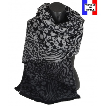 Châle épais et doux en 100% laine mérinos, noir motif fauve, fabriqué en France