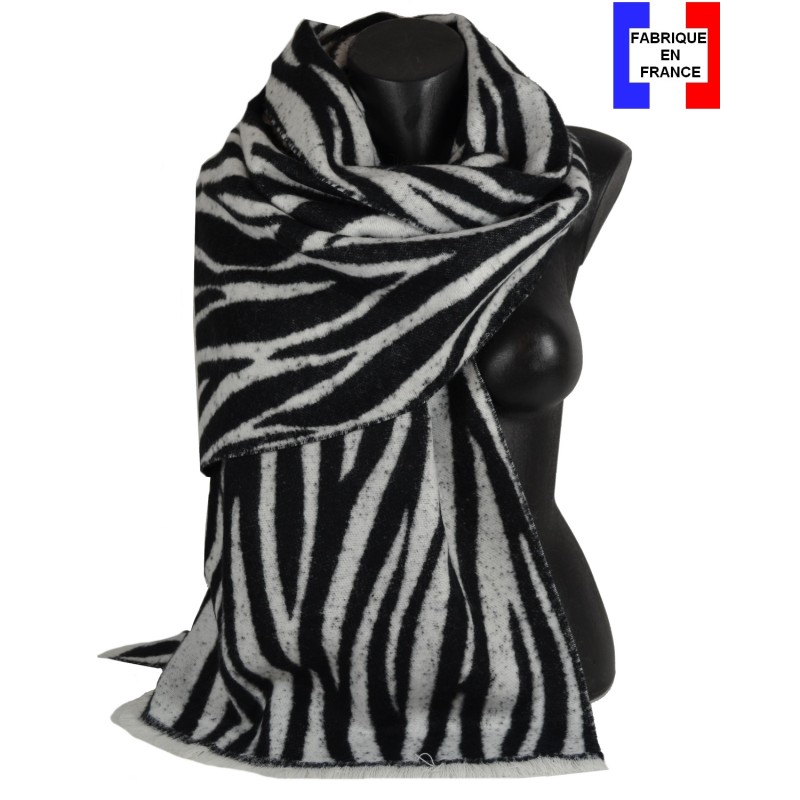 Châle doux en acrylique et mérinos, écru et noir, fabriqué en France