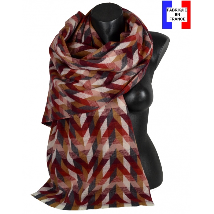 Châle en acrylique, bordeaux à franges courtes, motifs géométriques, fabriqué en France