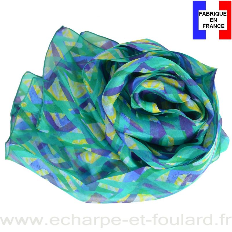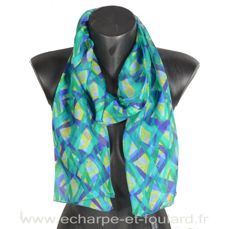 Foulard en mousseline de soie "Losange" vert, 32x156 cm, fabriqué en France