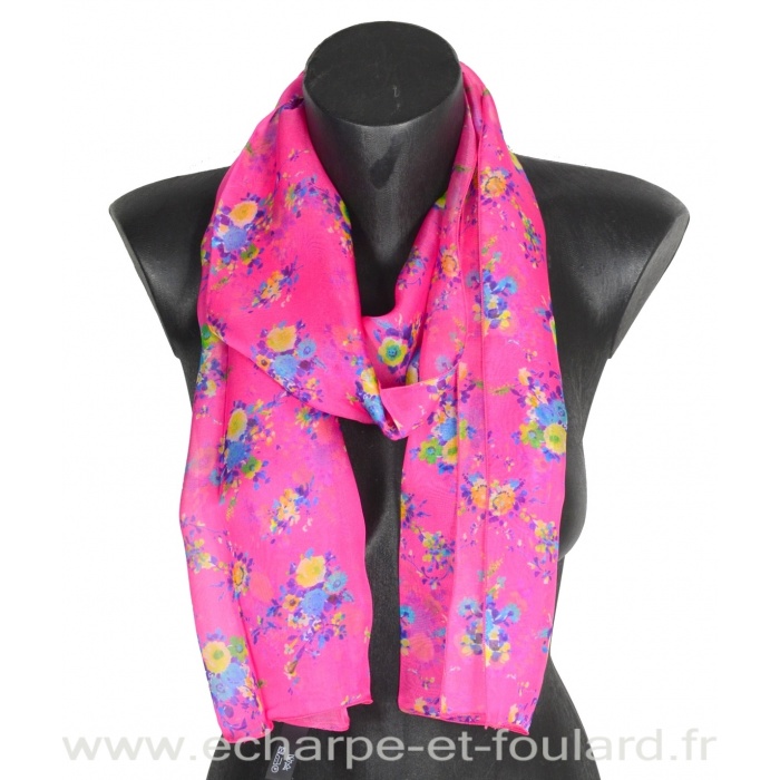 Foulard en mousseline de soie rose, 30x160 cm motif fleur, fabriqué en France